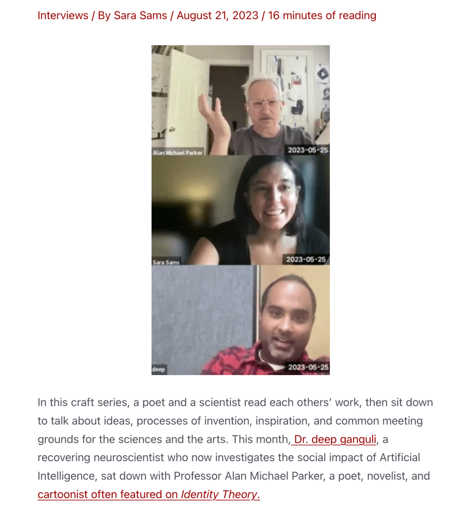 I had a conversation with scientist Dr. deep ganguli and scholar/writer Alan Michael Parker, up now at Identity Theory Magazine.